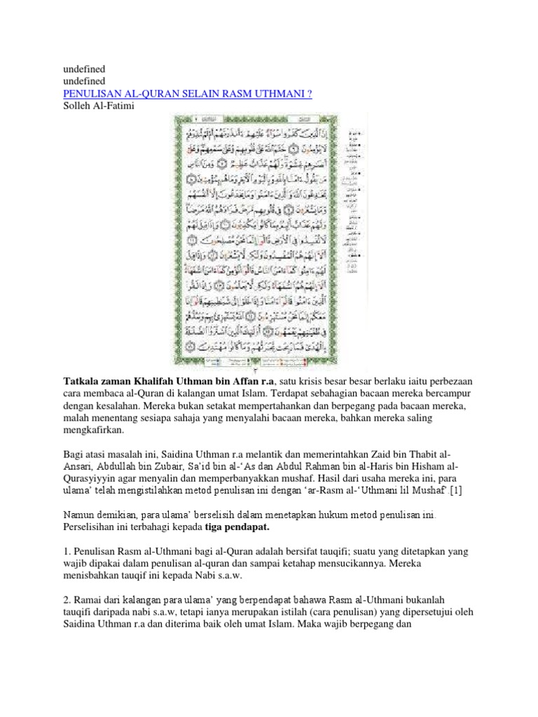 1 Rasm Uthmani antara cirinya. Rasm istikahiuthman iaitu penulisan menurut kaedah tertentu yang mana ia tidak sama dengan penulisan biasa dari segi sebutan disebabkan ia menggunakan beberapa kaedah seperti membuang menambah mengganti menyambung atau memisahkan huruf dan. Kurangnya pengetahuan masyarakat islam masa kini terhadap kaedah perbezaan antara rasm uthmani dan rasm imlai sebagaimana terhimpun dalam.