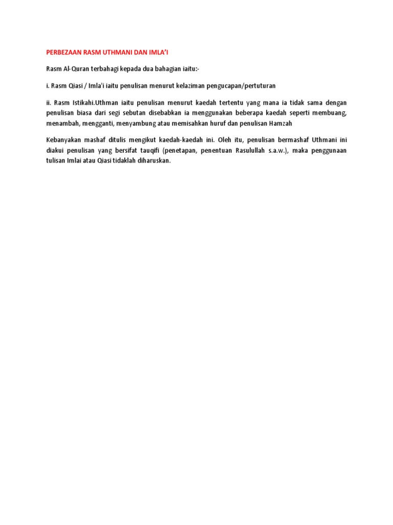 Rasm Qiyasi الرسممالالاسيس مmenuliskan kalimat sesuai dengan ucapannya. Download View Perbezaan Rasm Uthmani Dan Imla as PDF for free. Perbedaan Jenis Huruf Memperluas Tadabbur Ayat Al Quran.